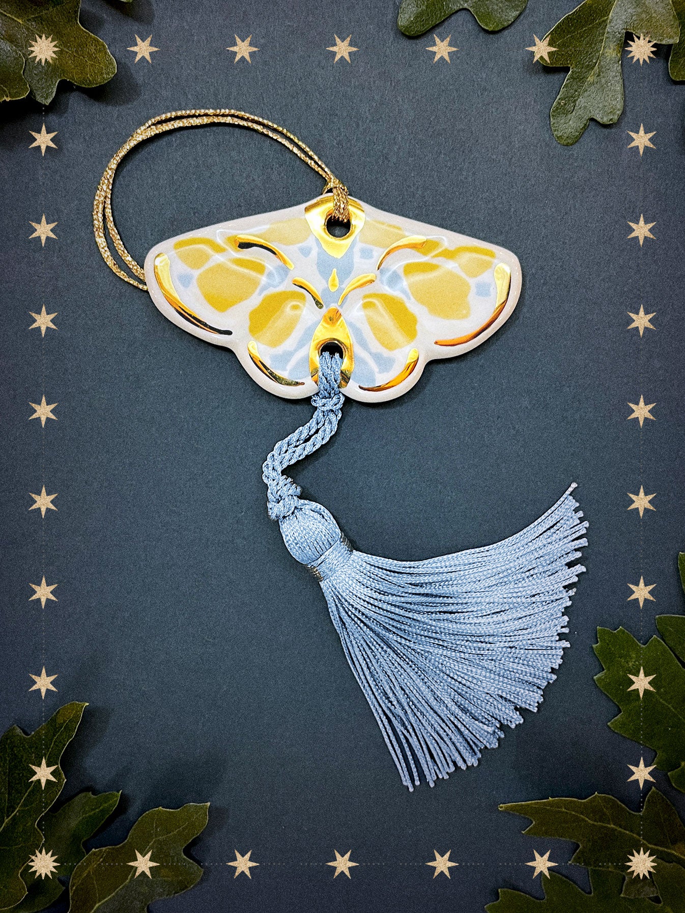 A stoneware ornament with hand painted gold lustre, in a keepsake box.