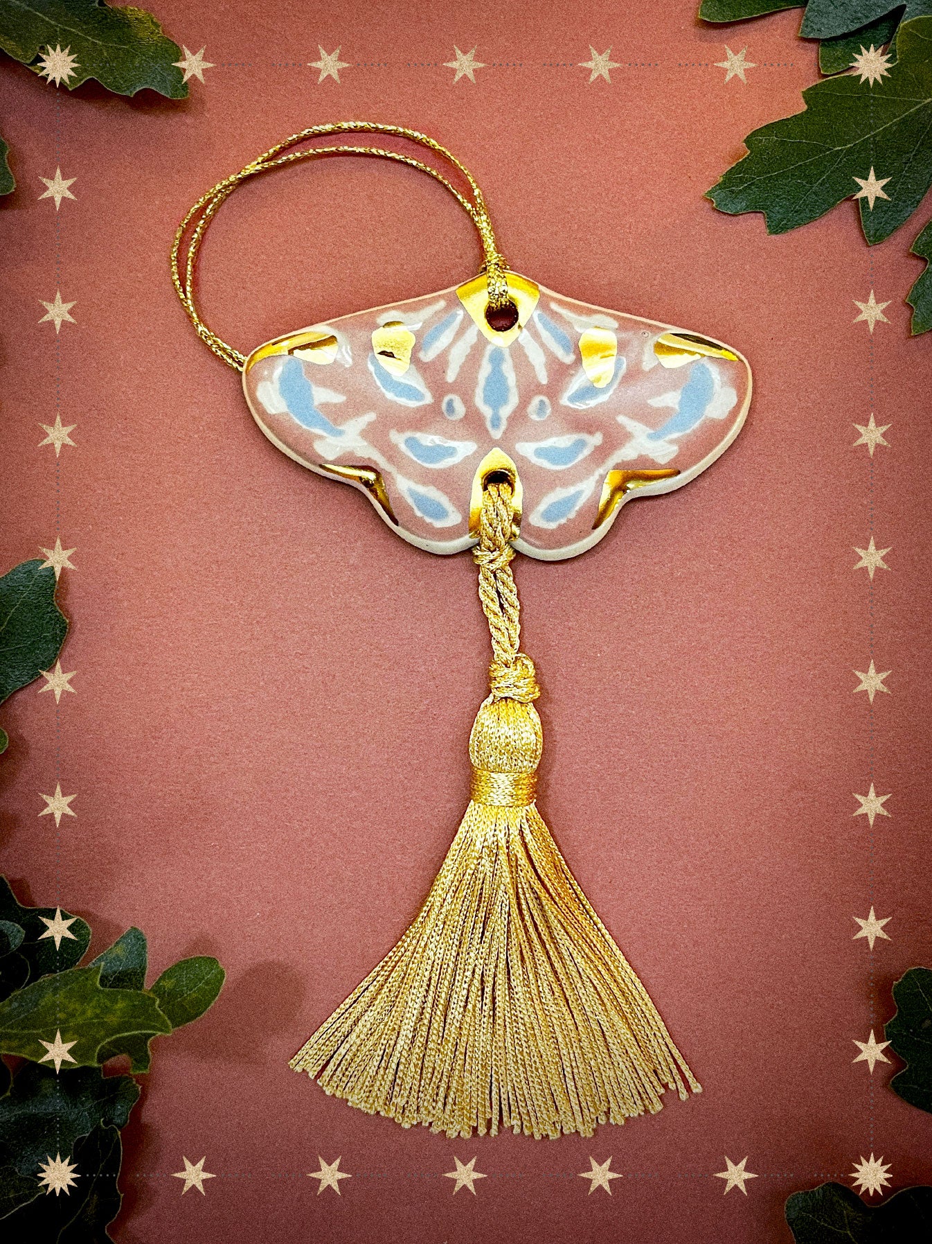 A stoneware ornament with hand painted gold lustre, in a keepsake box.